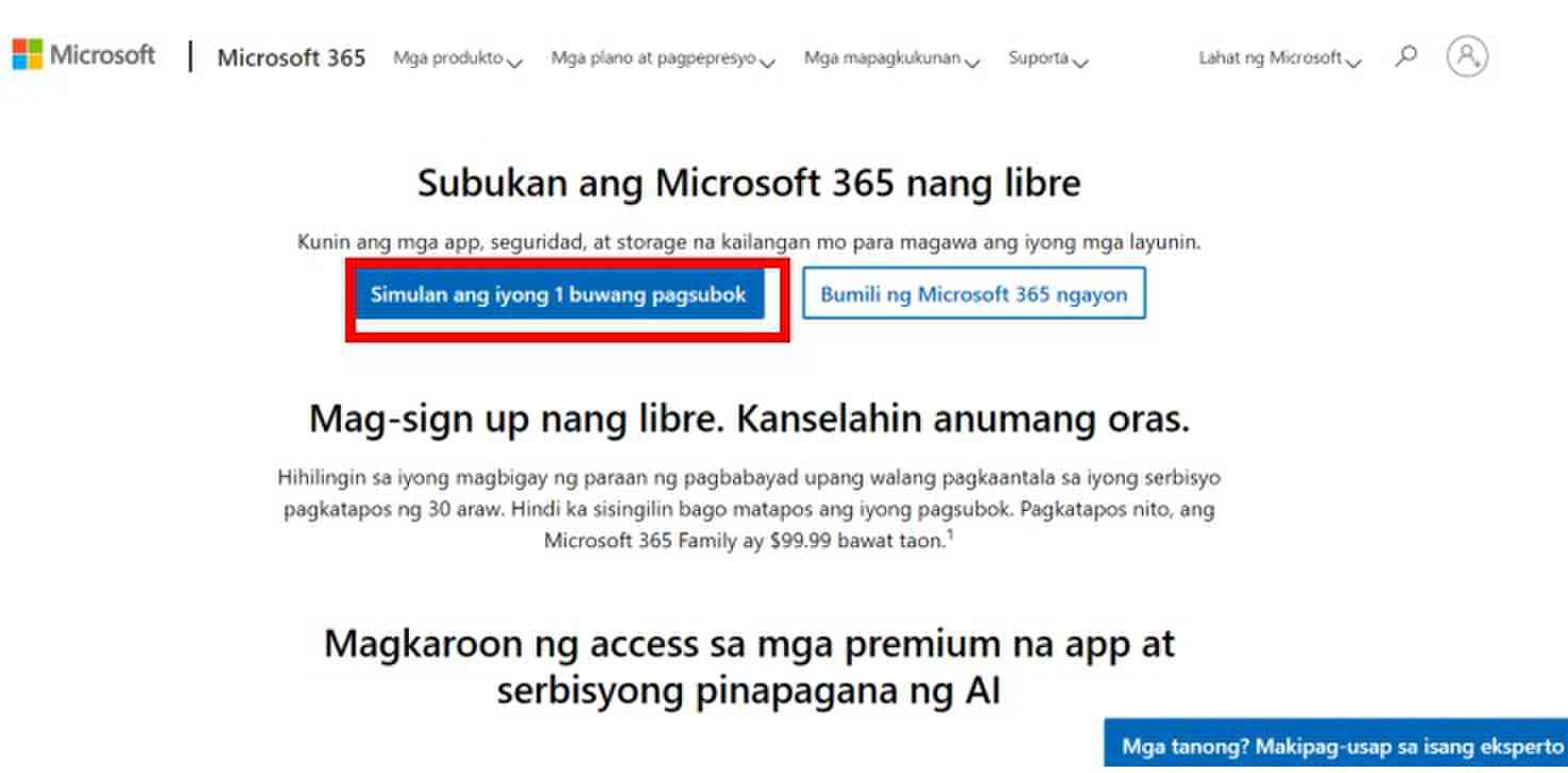 Narito ang mga hakbang upang mag-sign up para sa 1-buwan libreng pagsubok ng Microsoft 365: